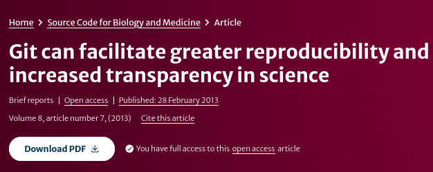 Version control systems (VCS), which have long been used to maintain code repositories in the software industry, are now finding new applications in science. One such open source VCS, Git, provides a lightweight yet robust framework that is ideal for managing the full suite of research outputs such as datasets, statistical code, figures, lab notes, and manuscripts. For individual researchers, Git provides a powerful way to track and compare versions, retrace errors, explore new approaches in a structured manner, while maintaining a full audit trail. For larger collaborative efforts, Git and Git hosting services make it possible for everyone to work asynchronously and merge their contributions at any time, all the while maintaining a complete authorship trail. In this paper I provide an overview of Git along with use-cases that highlight how this tool can be leveraged to make science more reproducible and transparent, foster new collaborations, and support novel uses.