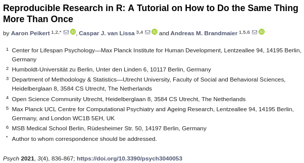 Computational reproducibility is the ability to obtain identical results from the same data with the same computer code. It is a building block for transparent and cumulative science because it enables the originator and other researchers, on other computers and later in time, to reproduce and thus understand how results came about, while avoiding a variety of errors that may lead to erroneous reporting of statistical and computational results. In this tutorial, we demonstrate how the R package